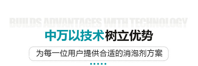 中萬是一家以解決各行業(yè)泡沫難題為使命的企業(yè),專注于各行業(yè)不同工藝的泡沫應用研究,擁有8大體系成分產(chǎn)品,近2000個不同行業(yè)、不同細分領域工藝的成功應用經(jīng)驗與解決方案,為您的生產(chǎn)工藝保駕護航。中萬在化工泡沫領域扮演著重要的角色,從嚴謹?shù)倪x料到獨特的應用方案,推動著整個消泡劑行業(yè)的優(yōu)化升級,中萬因領先而備受推崇,用技術成就高效,提方案帶來卓越,讓服務適應市場,中萬在消泡劑精益求精的道路上不斷地為客戶謀發(fā)展而開拓創(chuàng)造。